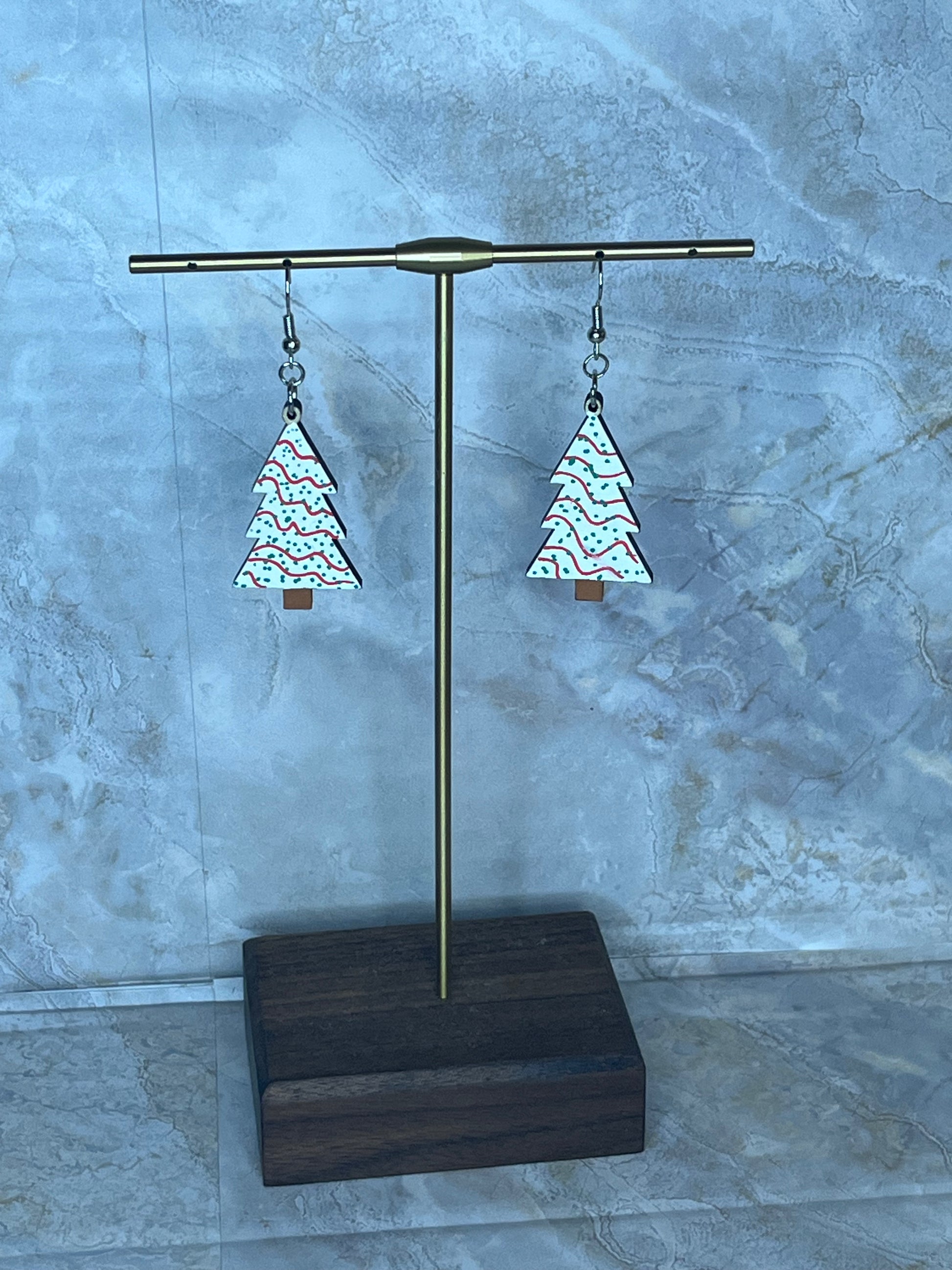 This is a wood earring with colored paint to accent features of design. Hook for earrings is hypoallergenic with plastic backing. Earring is handmade