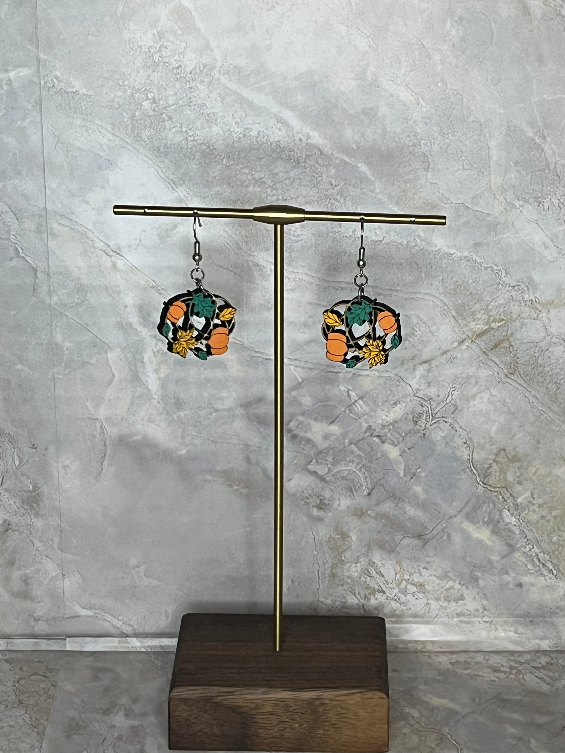 This is a wood earring with colored paint to accent features of design. Hook for earrings is hypoallergenic with plastic backing. Earring is handmade