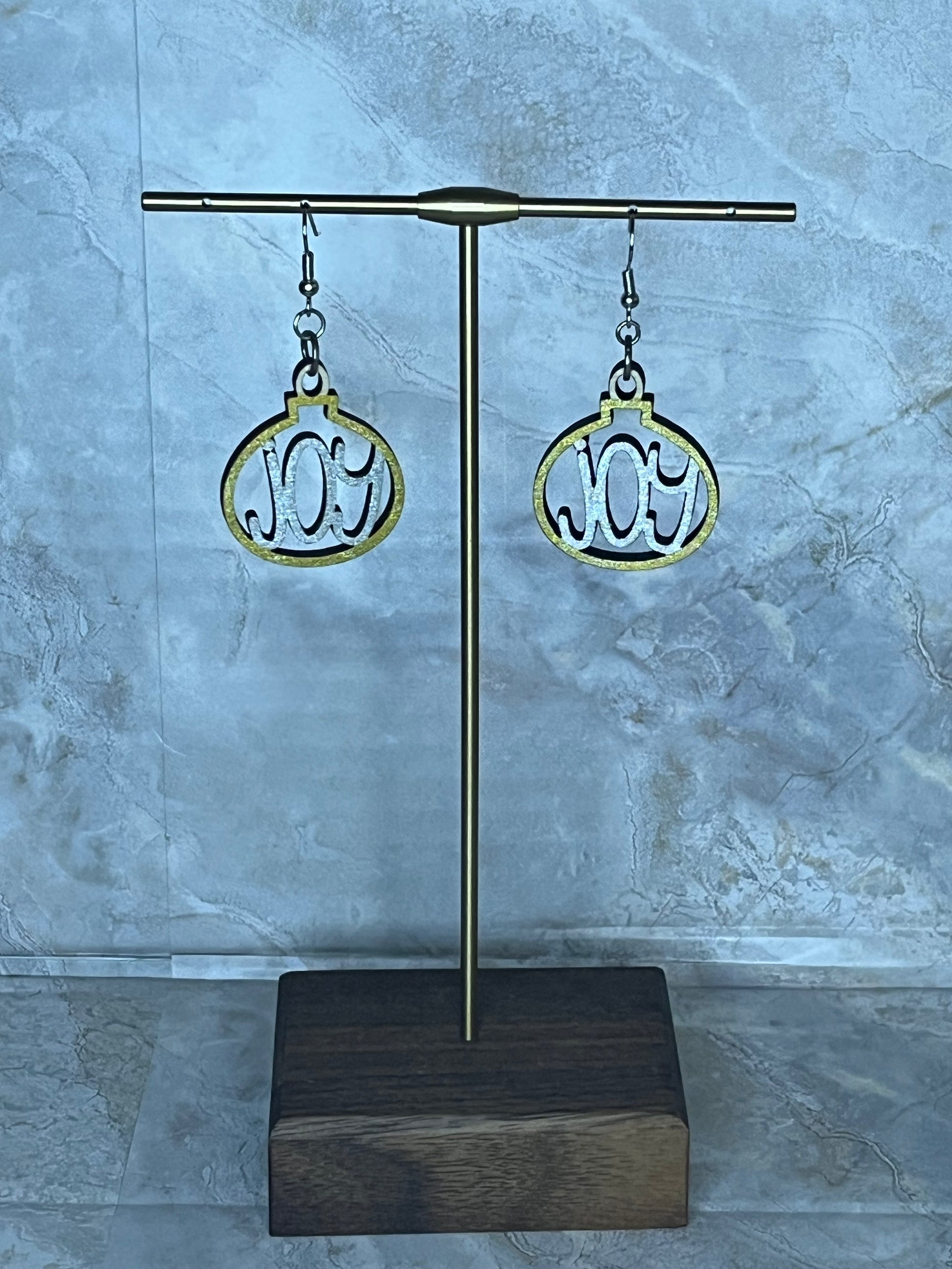 This is a wood earring with colored paint to accent features of design. Hook for earrings is hypoallergenic with plastic backing. Earring is handmade
