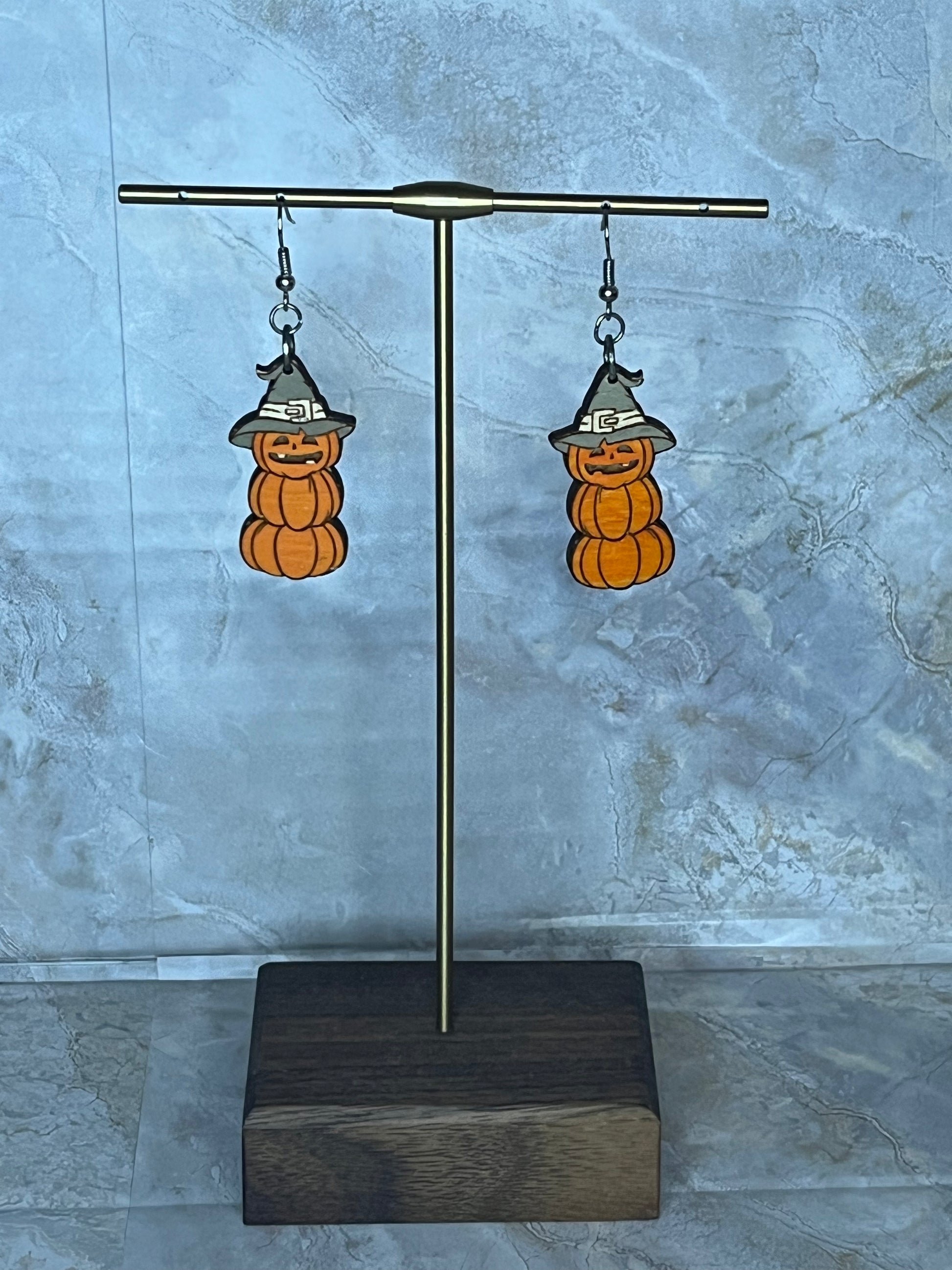 This is a wood earring with colored paint to accent features of design. Hook for earrings is hypoallergenic with plastic backing. Earring is handmade